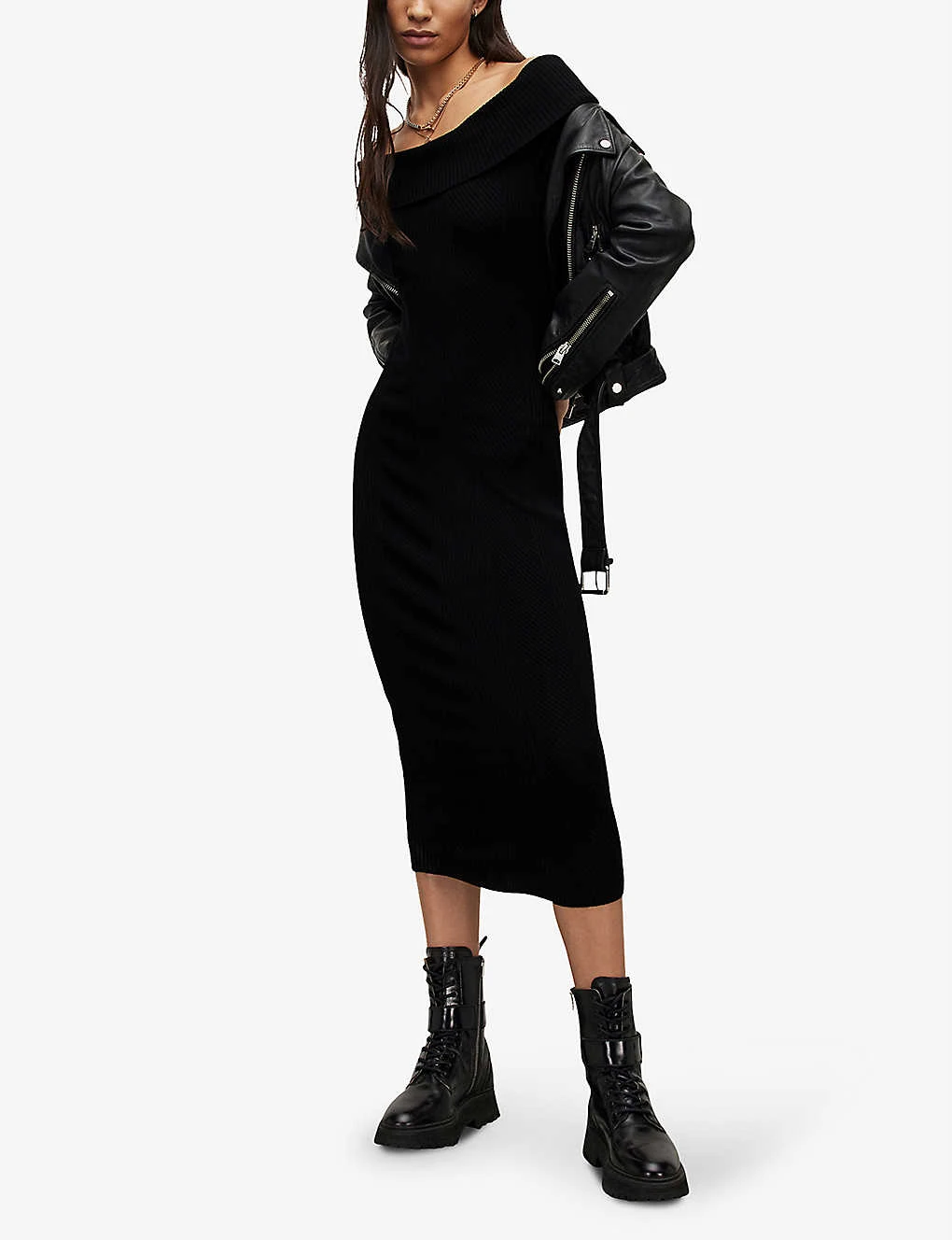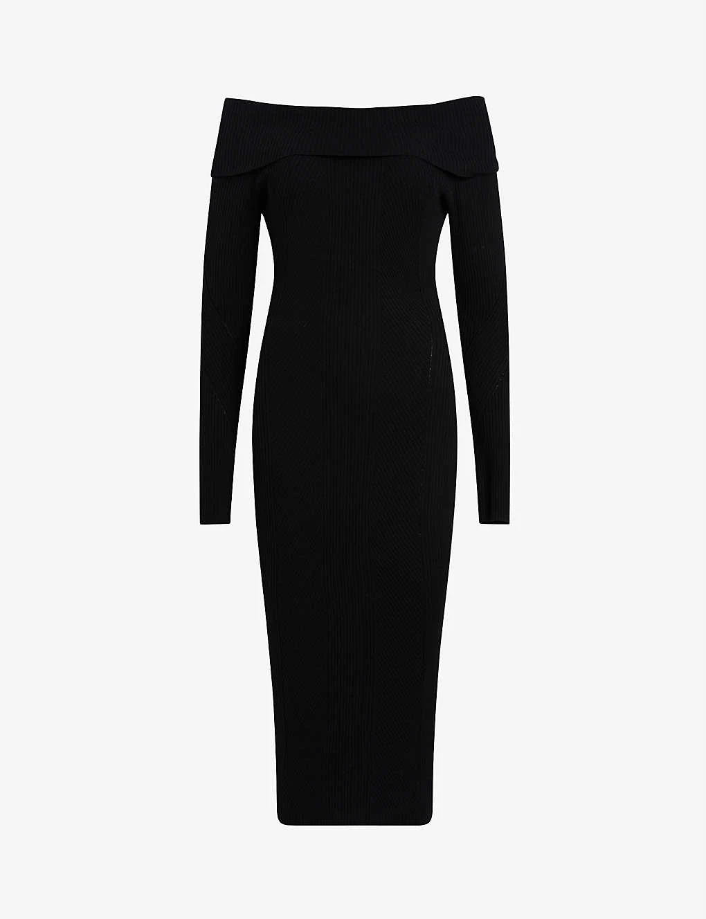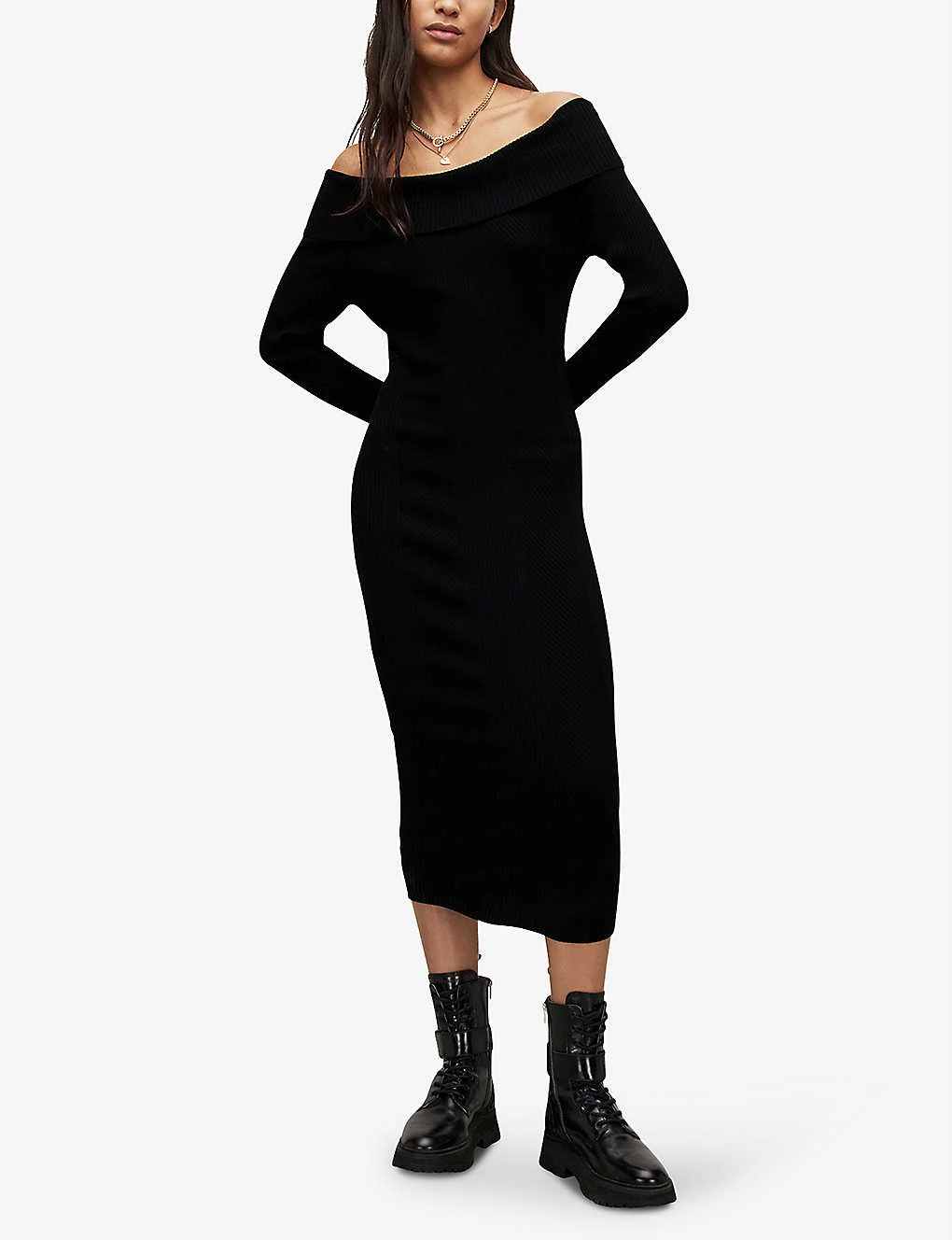 - Off-the-shoulder folded neckline, long sleeves, bodycon fit, midi length