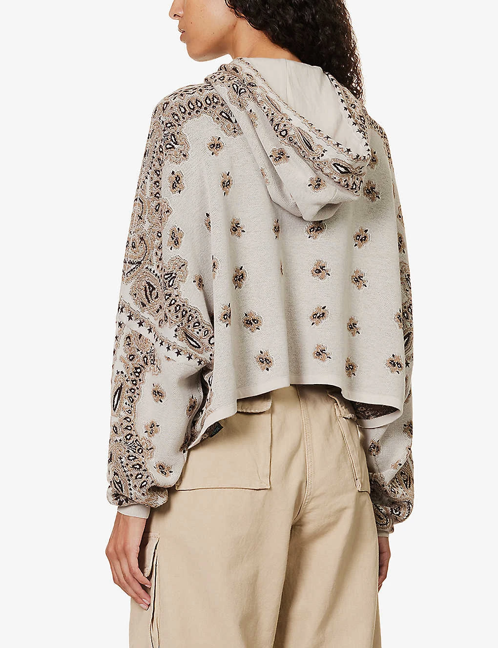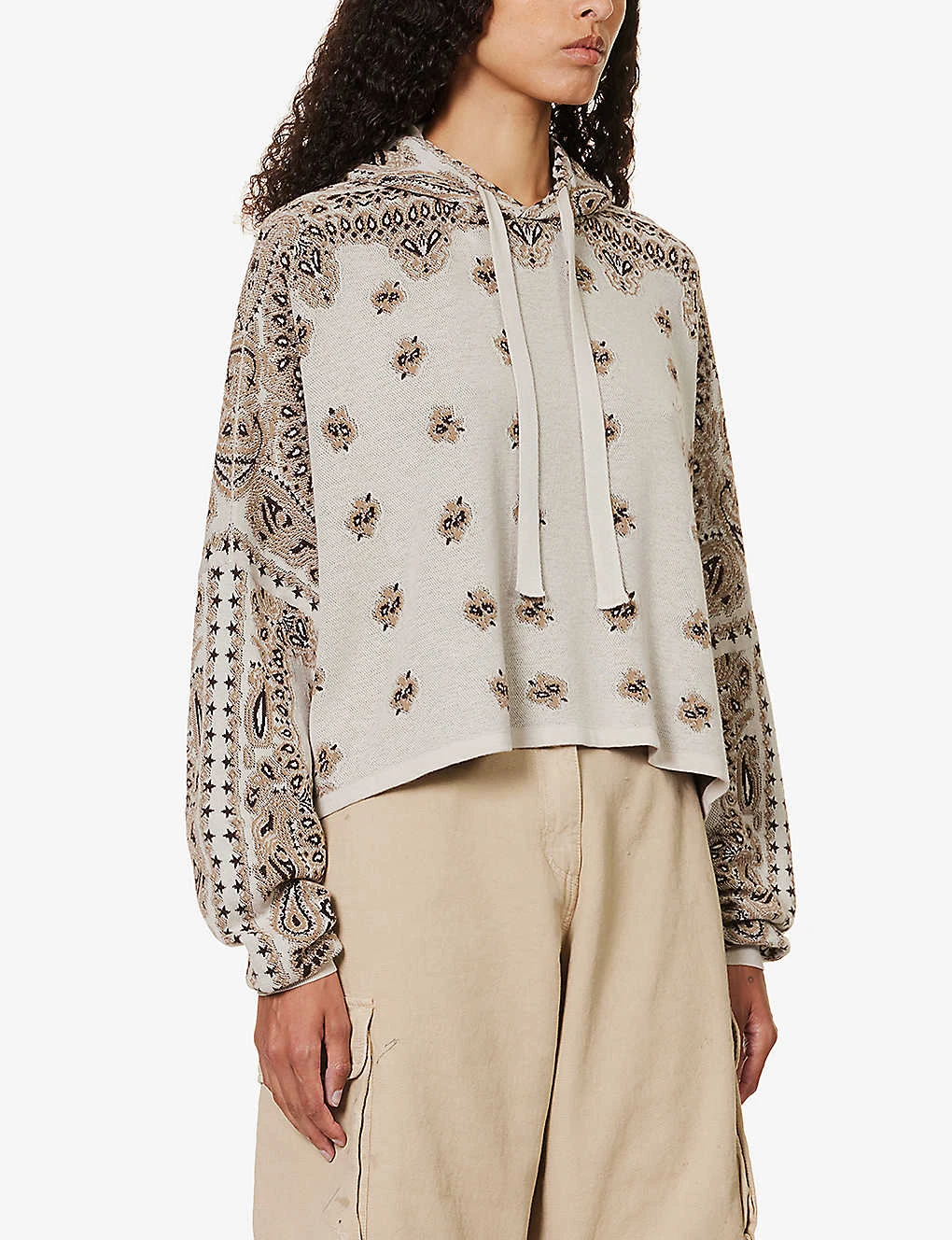 - Relaxed fit, drawstring hood, dropped shoulders, long sleeves, fine knit texture, bandana pattern, cropped