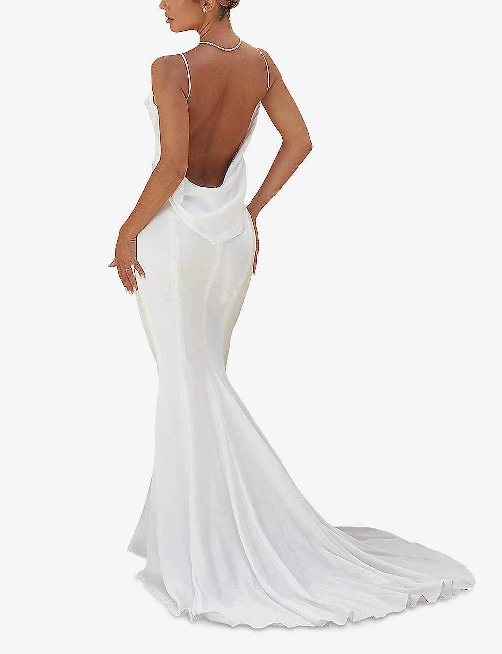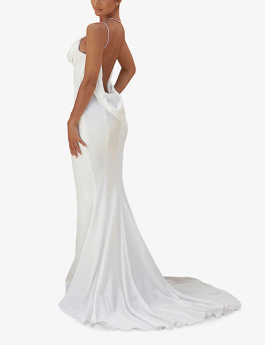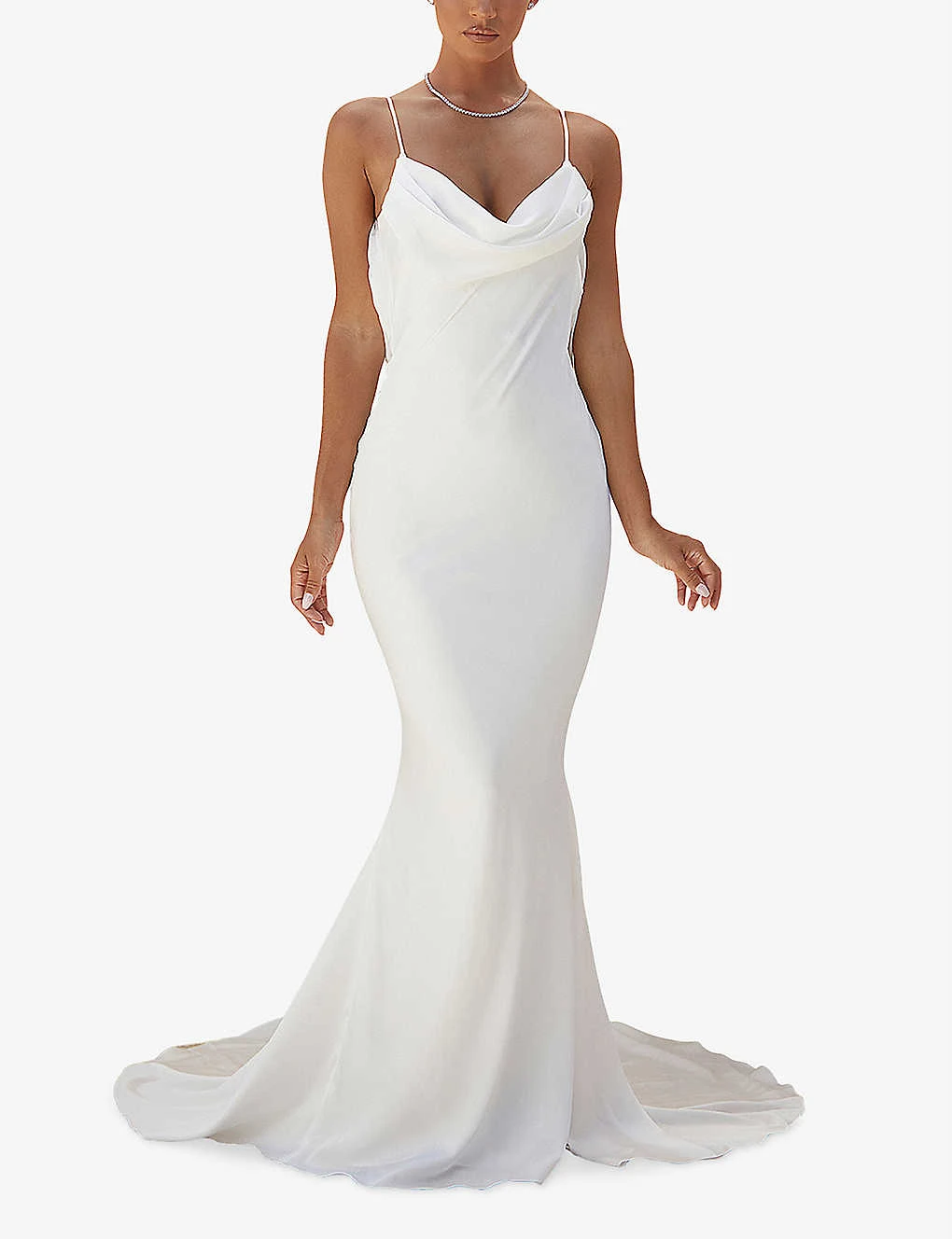 - Regular fit, cowl neckline, shoulder straps, bias cut, low-cut draped back, sweep train at back, all-over satin texture, fully lined