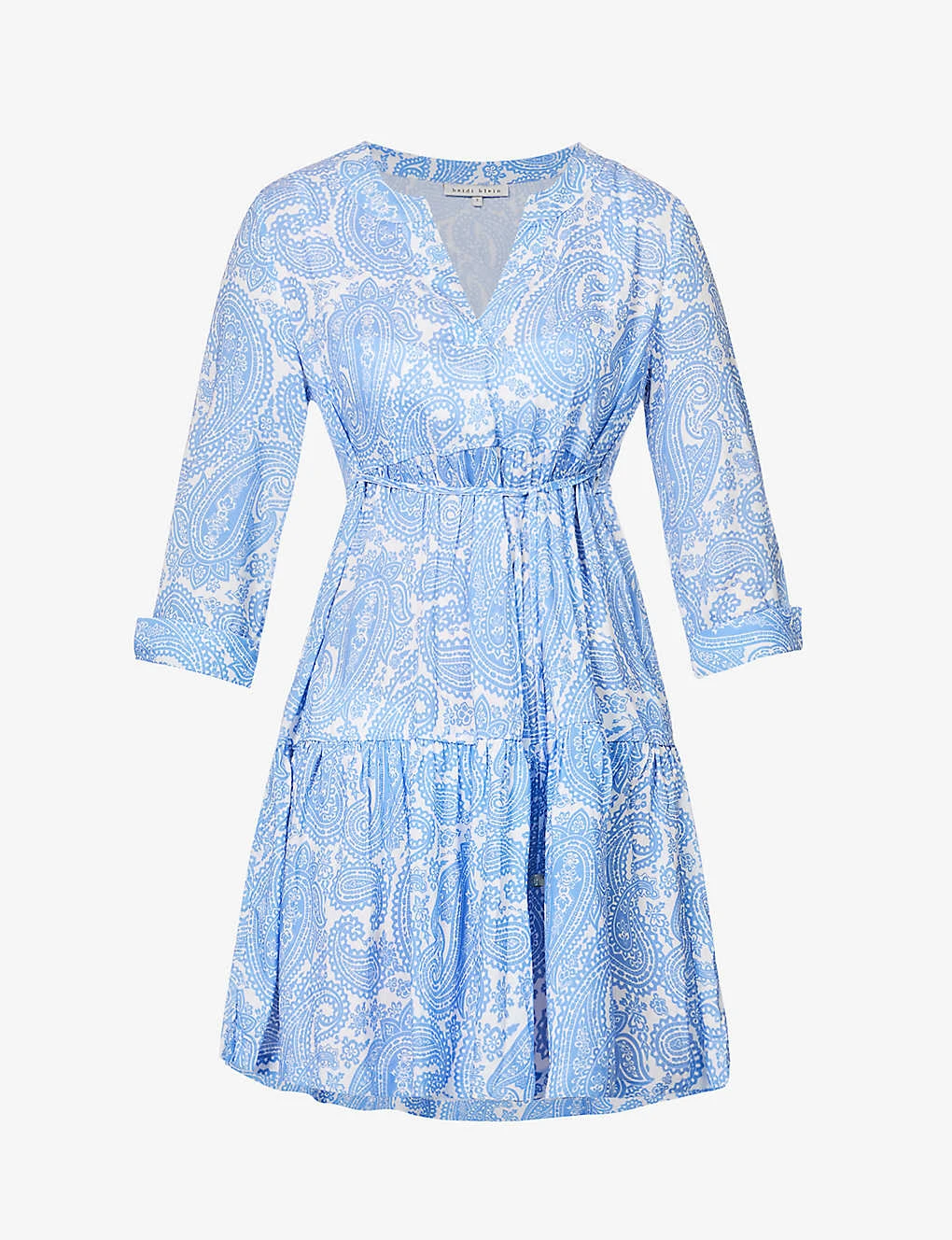 - Relaxed fit, V-neck, 3/4 length sleeves, self-tie fastening at waist, all-over print, tiered hem