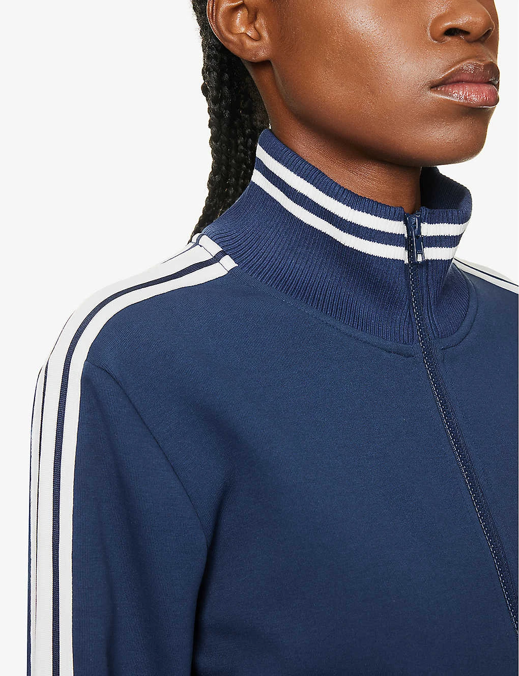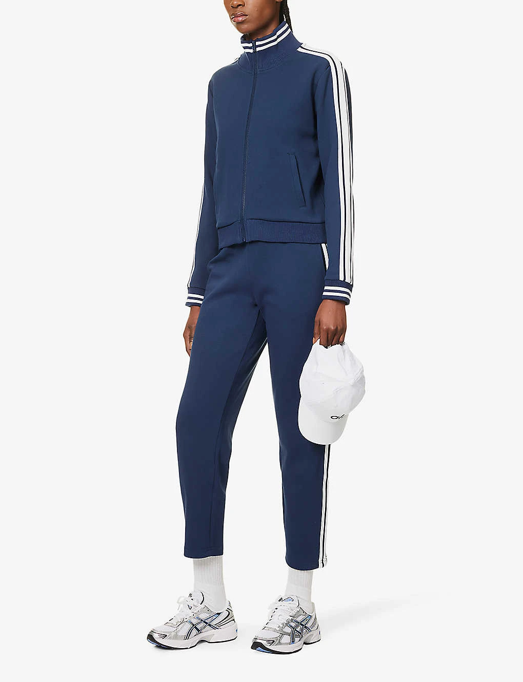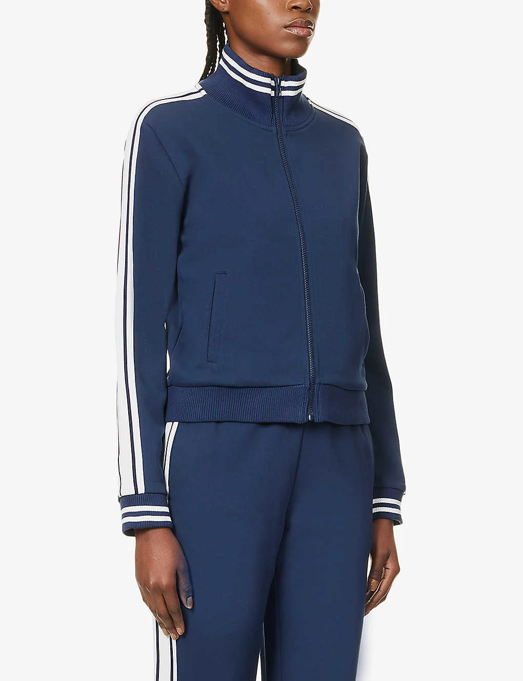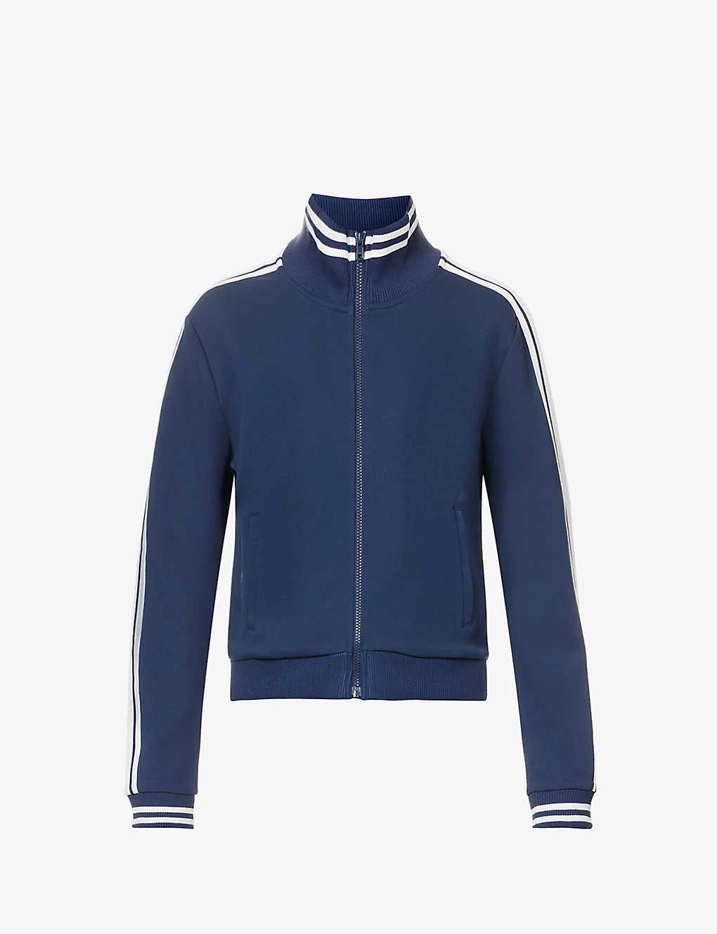 - Regular-fit, high neck, long sleeves, striped panels at sides, two welt pockets at front, brand print at back, ribbed trims