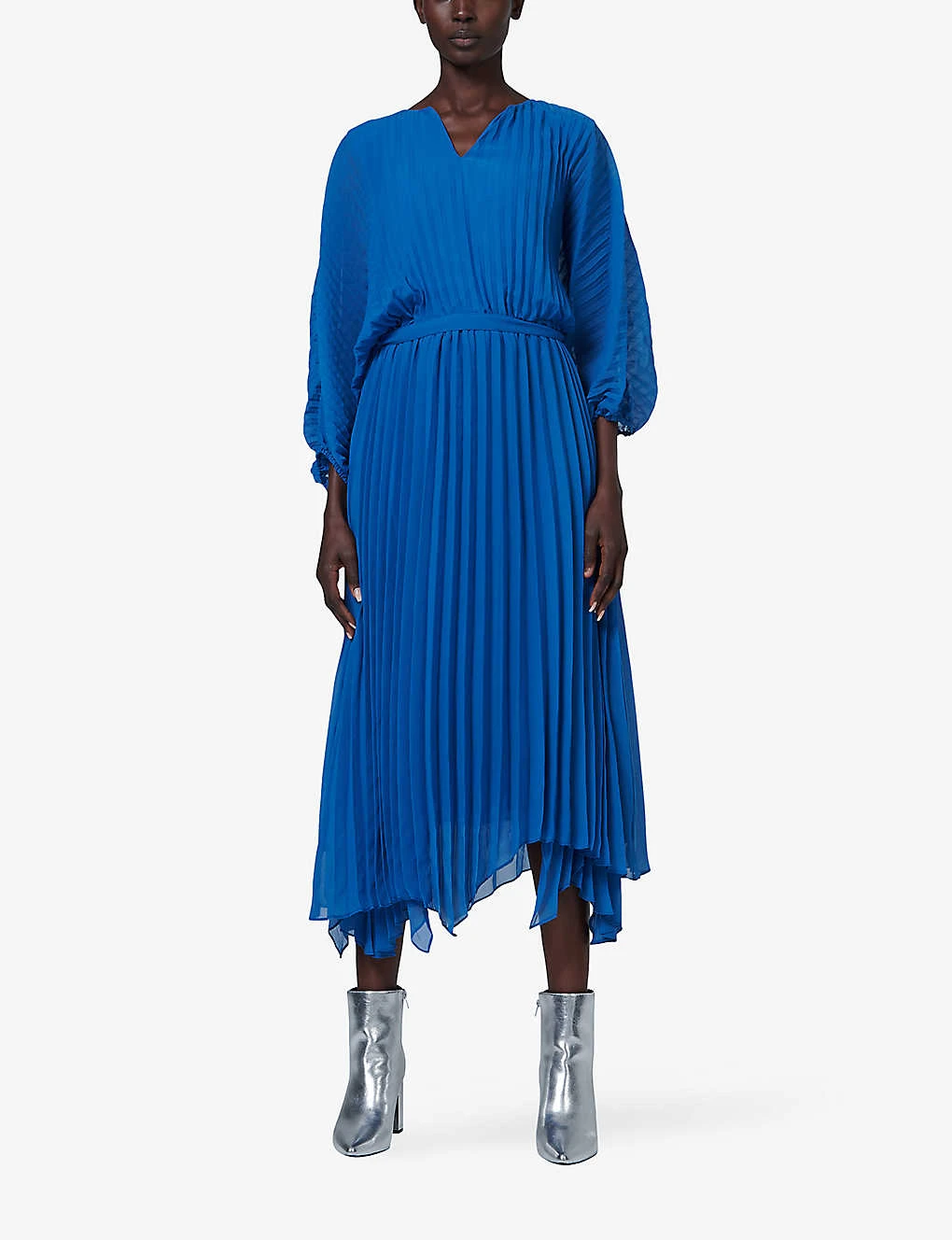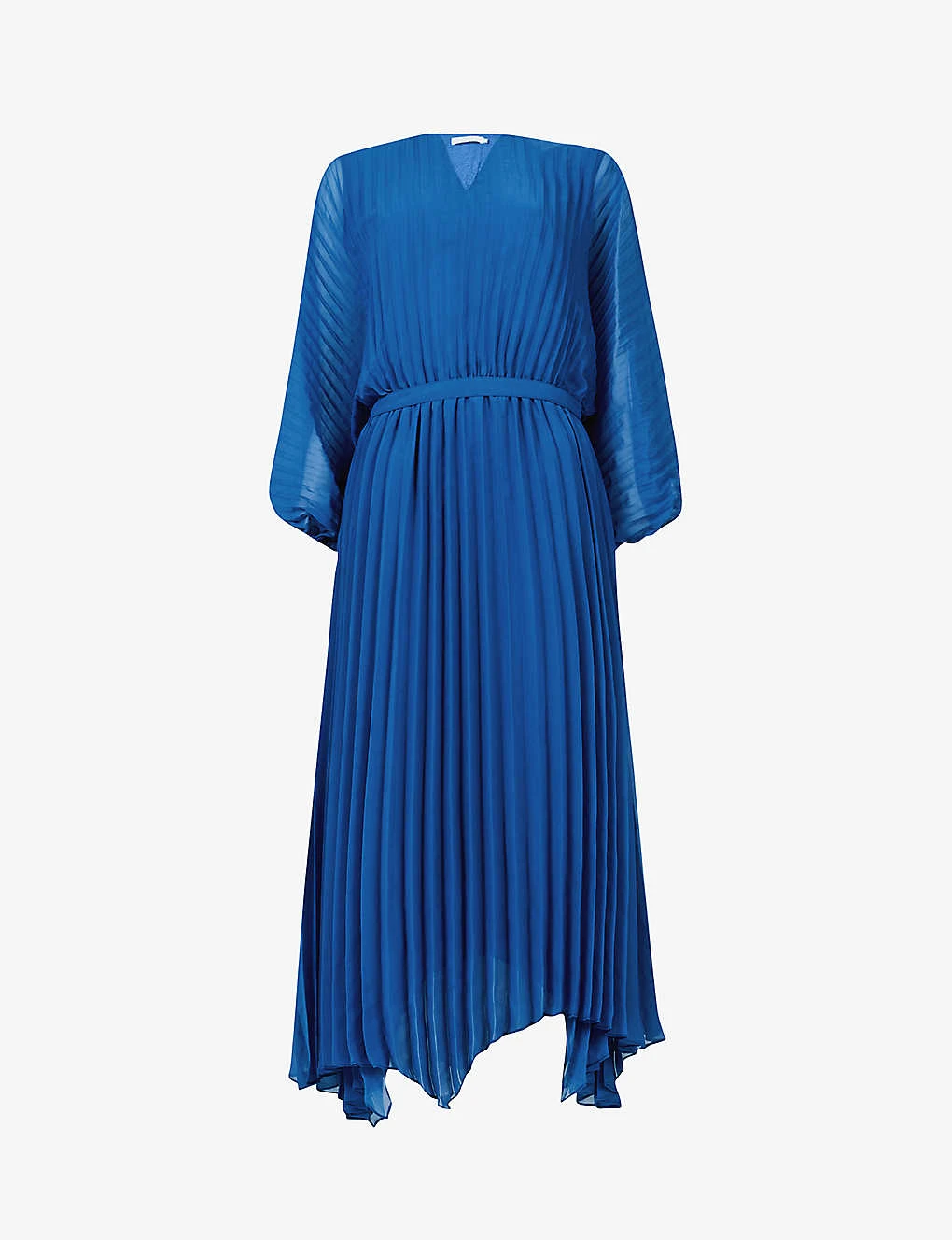 - V-neck, three-quarter-length balloon sleeves, elasticated waist, all-over pleated fabrication, handkerchief-hem, lined