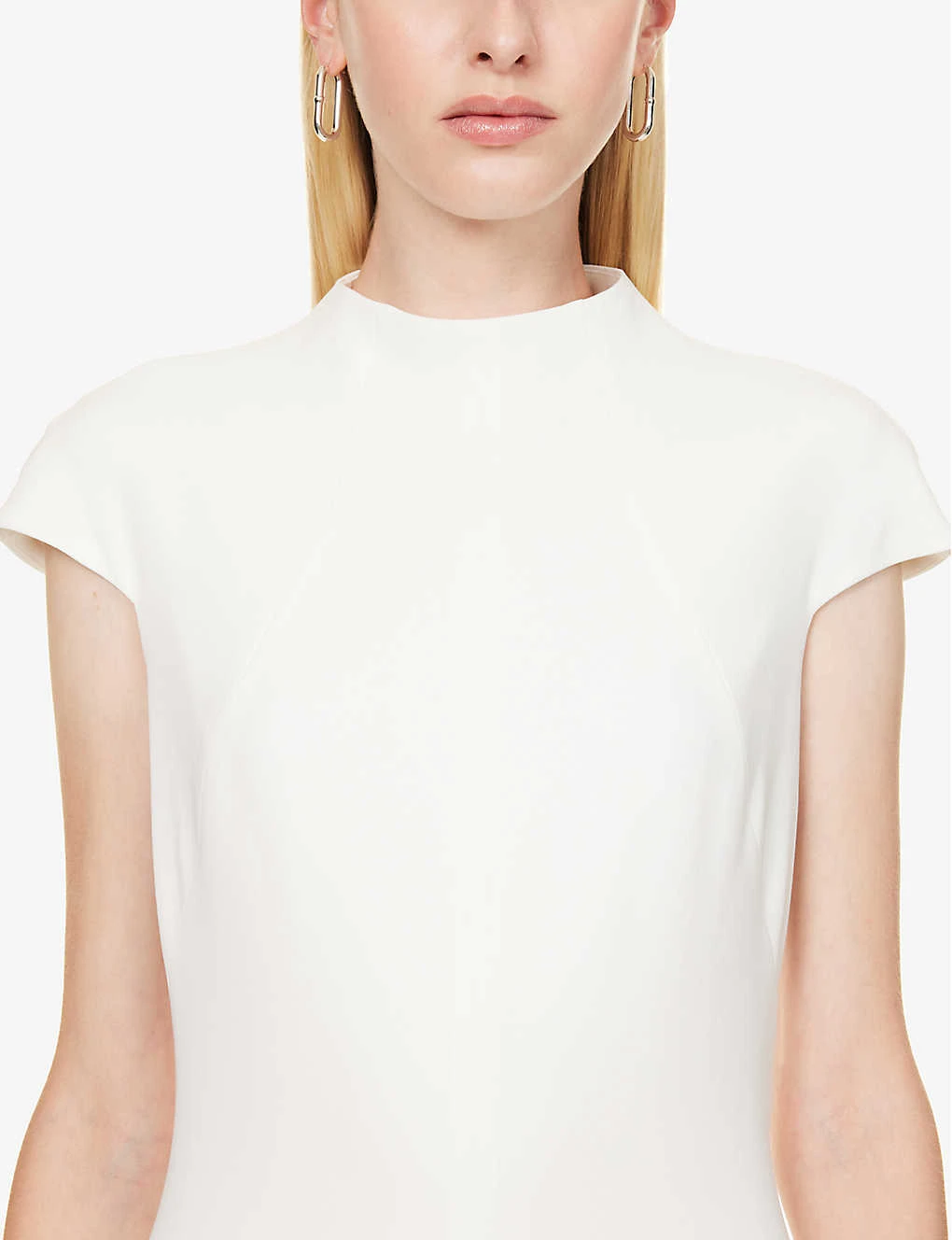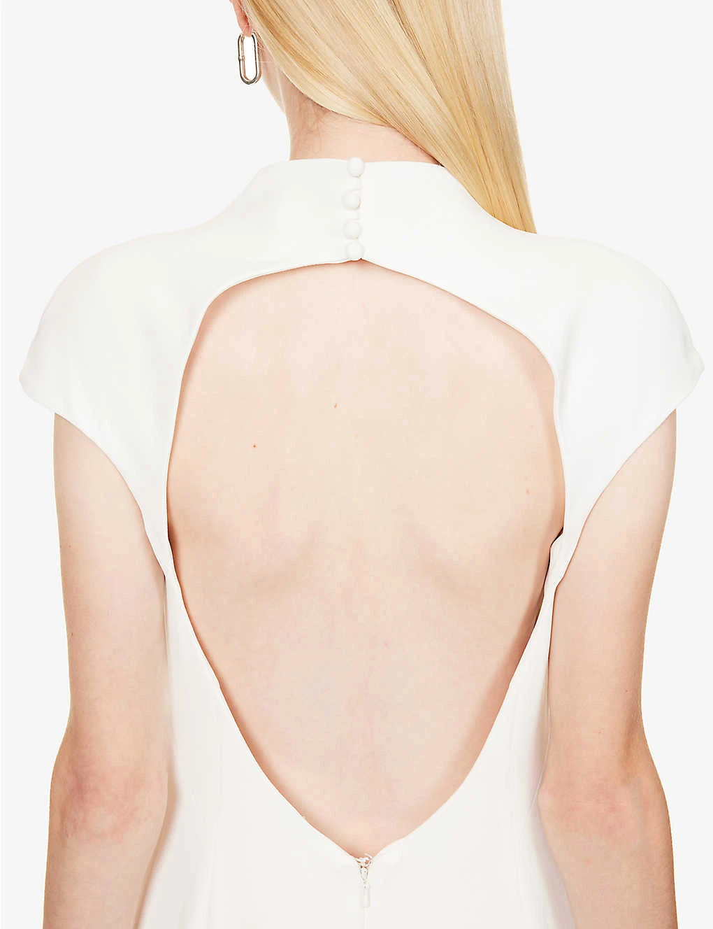 - Regular fit, high neck, embellished collar, short capped sleeves, cut-out at back, crepe texture, flared dipped hem, fully lined