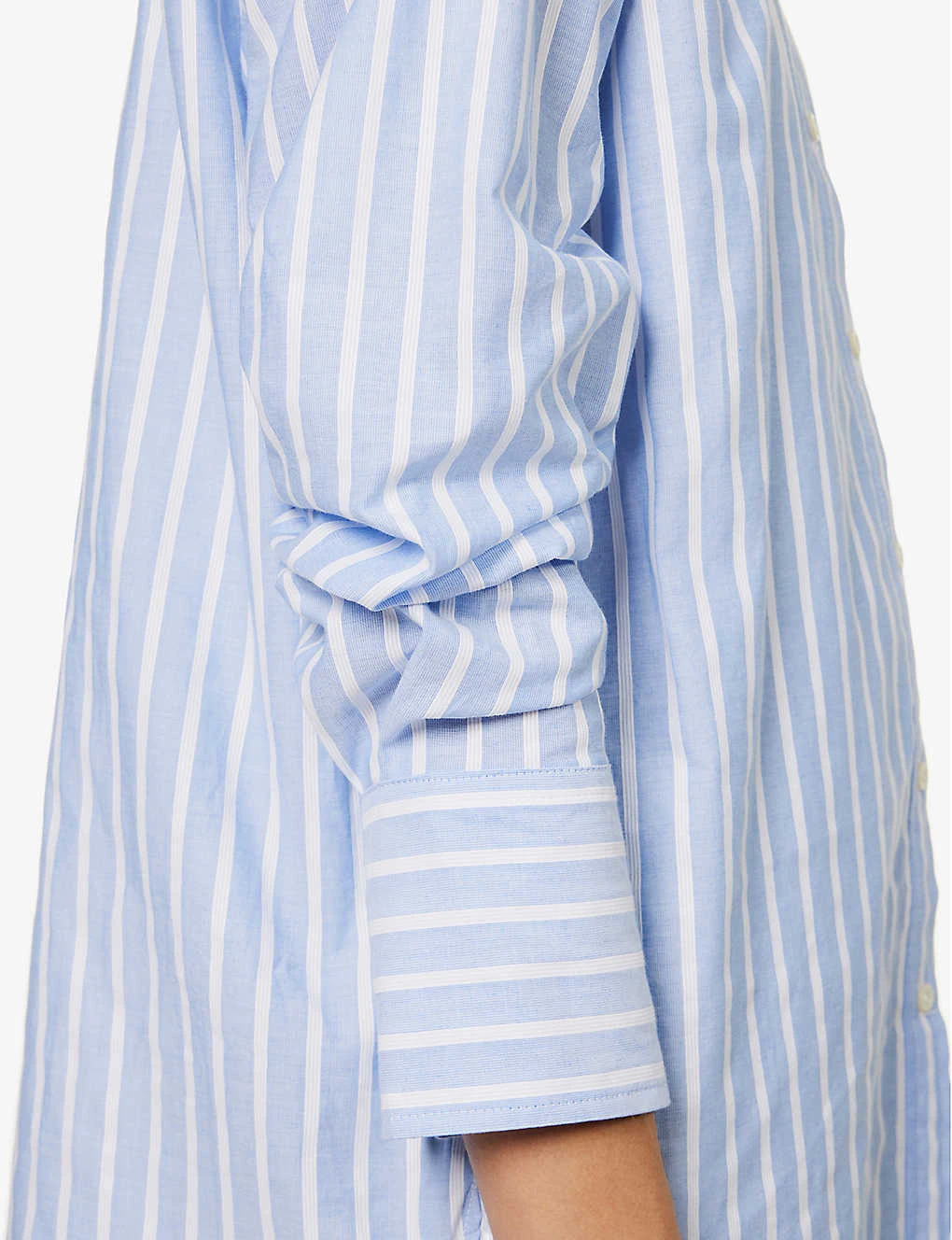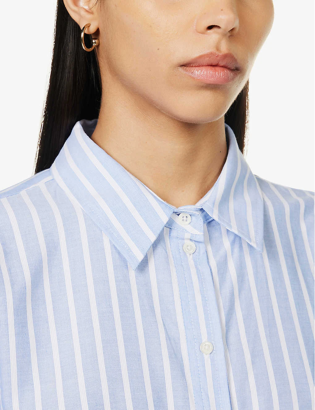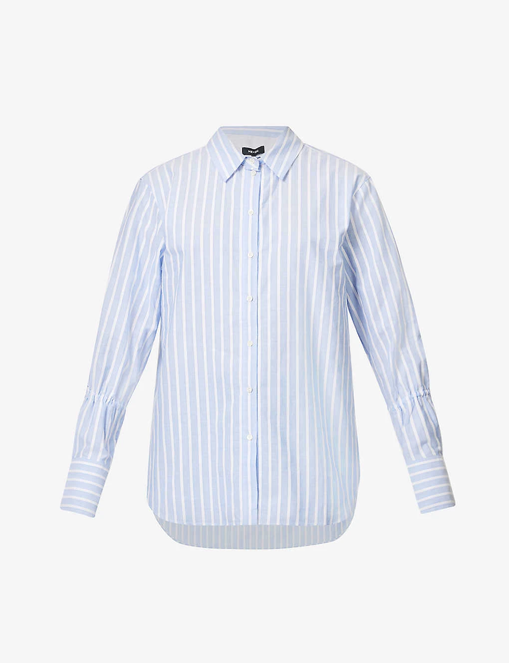 - Boyfriend-fit, round neck, collar, long sleeves, buttoned cuffs, pearlescent buttons, all-over striped weave, box-pleat at back, curved hem