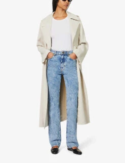 - Regular fit, mid-rise, belt loops, five pockets, brand patch at back, faded wash and whiskering, distressed, raw cuffs