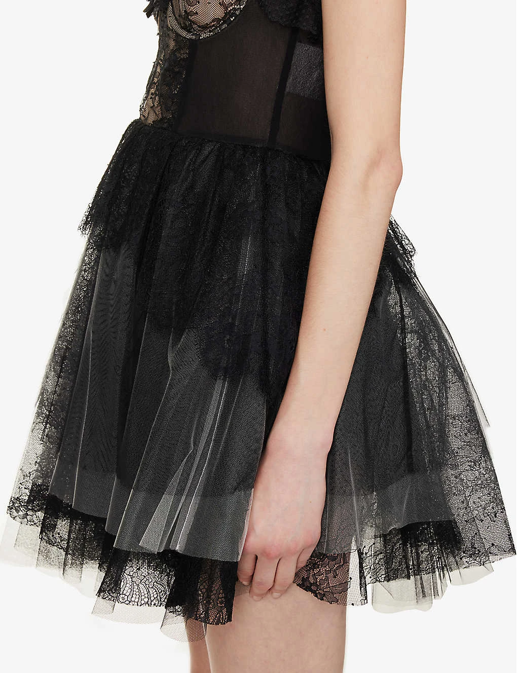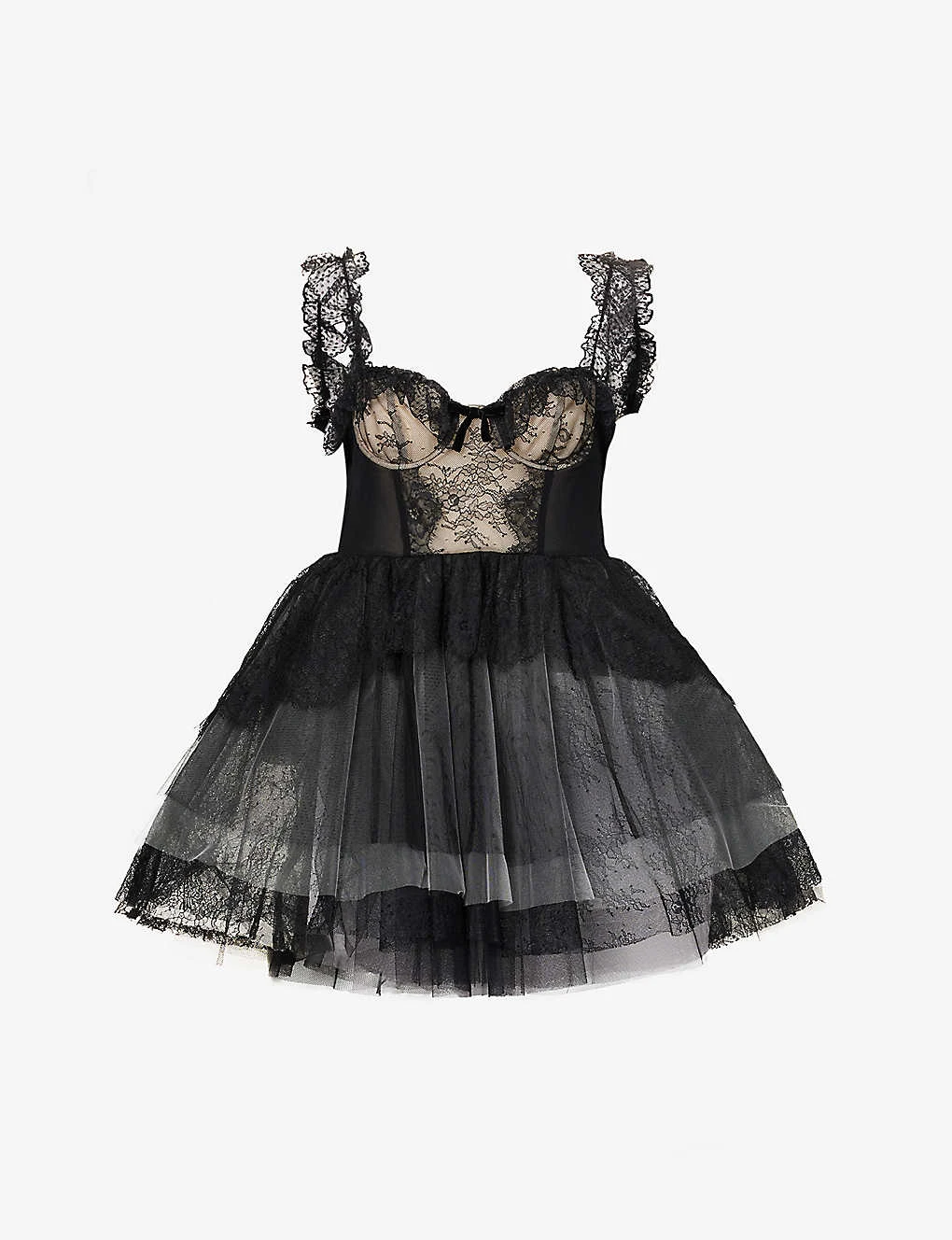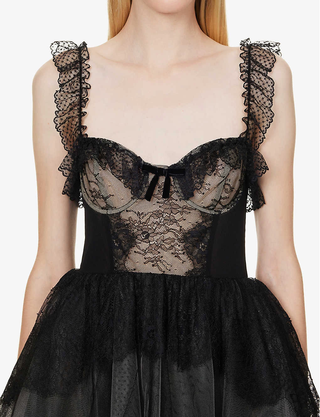 - Regular fit, sweetheart neckline, elasticated lace shoulder straps, bra underwire, bow trim at front, contrast panels, ruffle trims