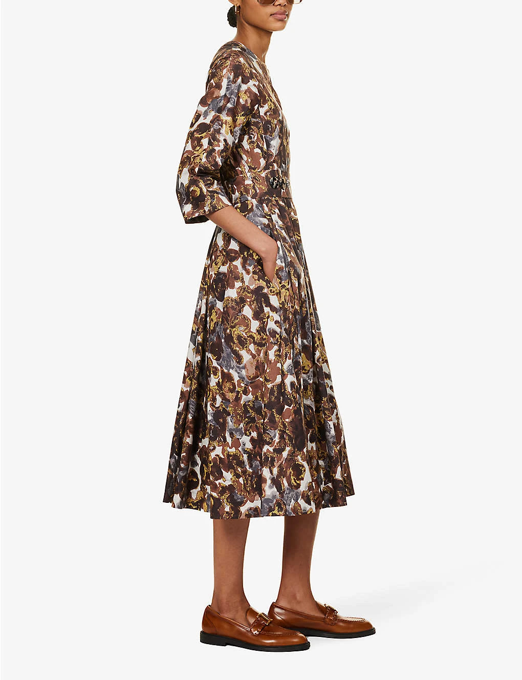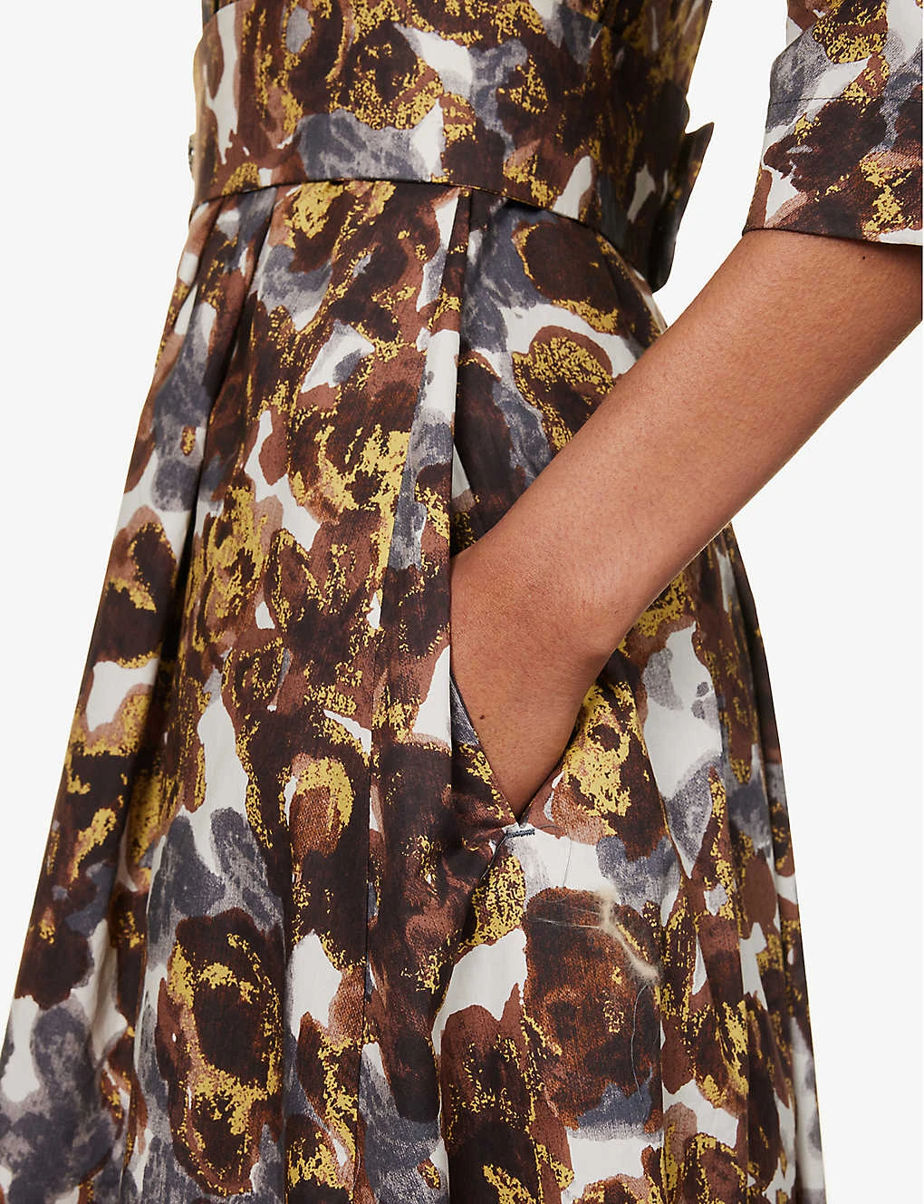 - Regular fit, V-neckline, long sleeves, structured waistband, two slip pockets at front, detachable self-tie belt, abstract pattern, pleated flared hem