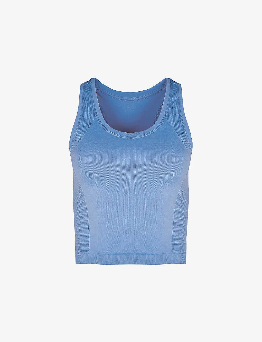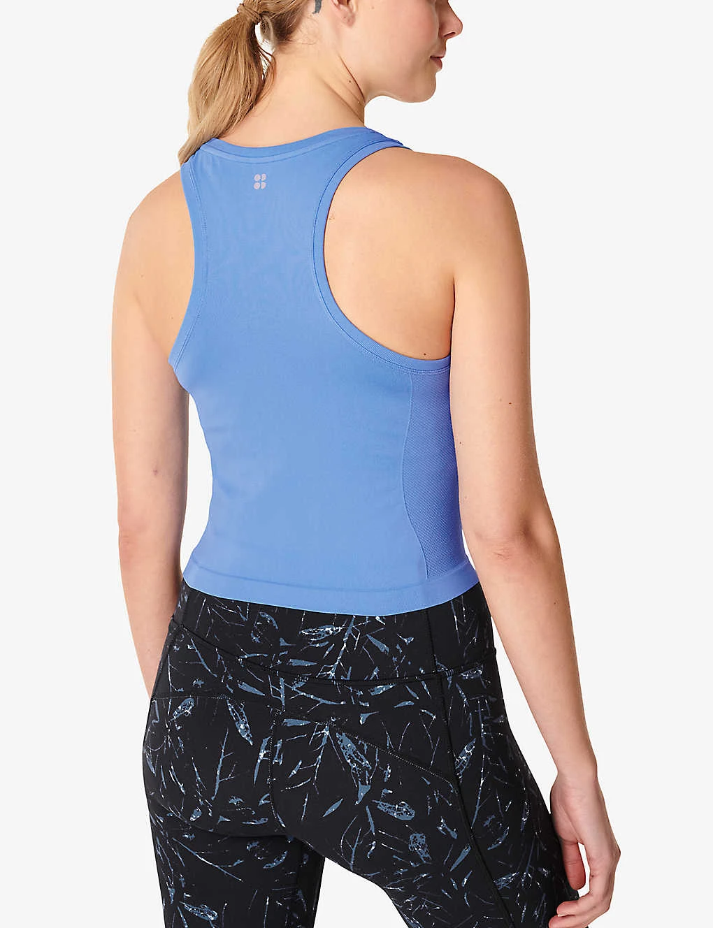 - Round neck, sleeveless, sweat wicking, waffle panels, seamless edges, ribbed trims, cropped length, racer back
