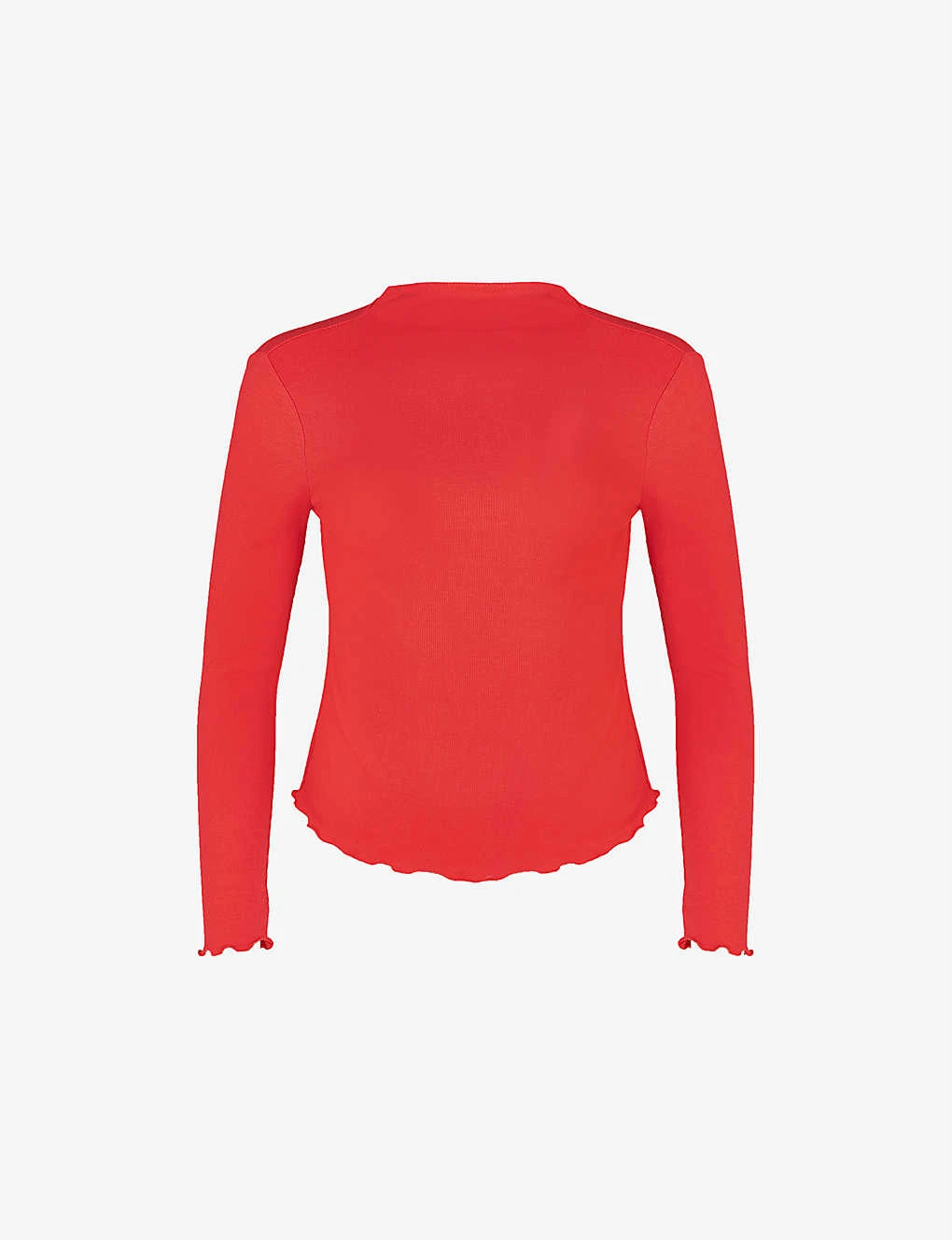 - Funnel neck, long sleeves, scalloped trims, round hem