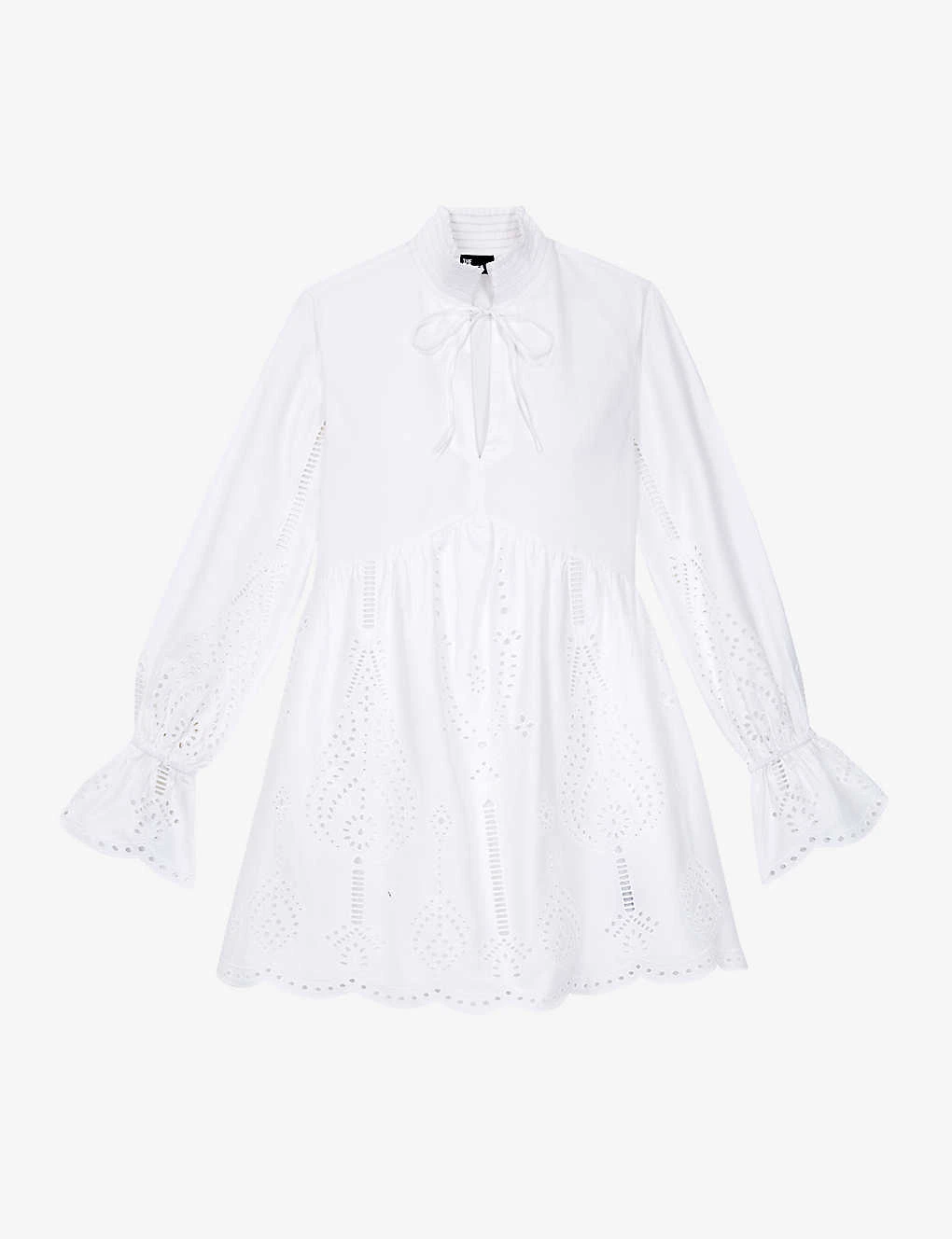 - High ruched neck, self-tie a the neckline, long sleeves, elasticated cuffs, openwork and broderie anglaise details, scalloped trim