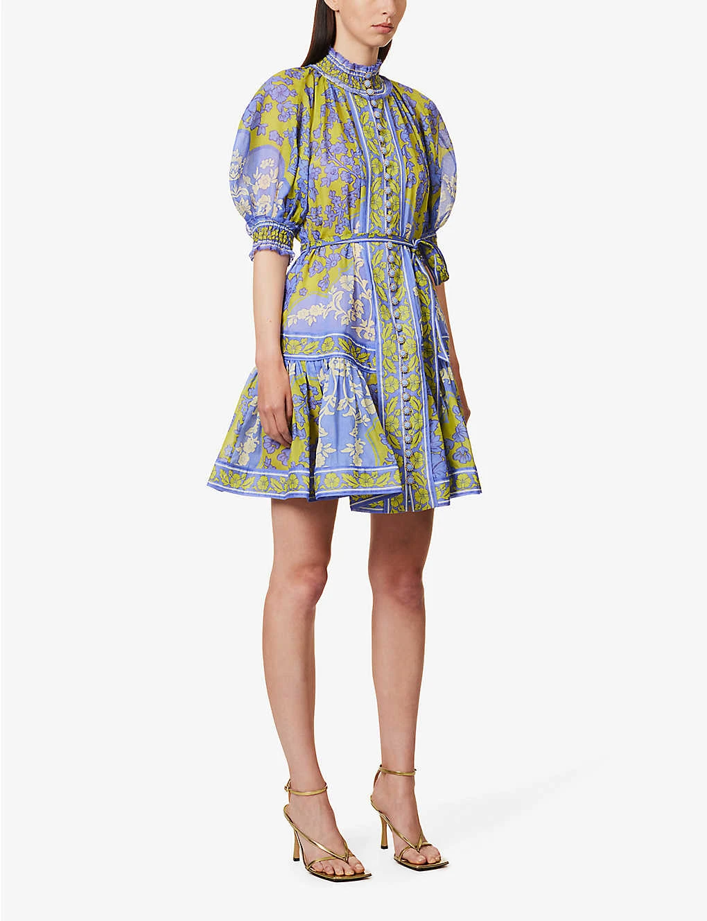 - Regular fit, high neck, short puff sleeves, shirred panels, belt loops, detachable self-tie fastening at waist, tiered hem, all-over print